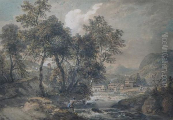 A Fisherman In A River Landscape A Village Beyond