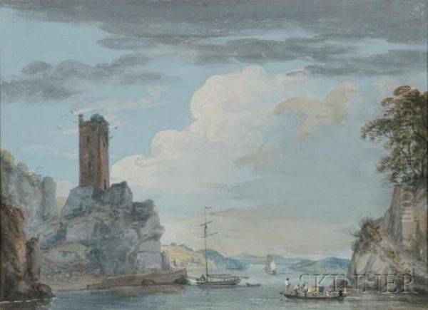 River Landscape With Ferry And Ruined Tower