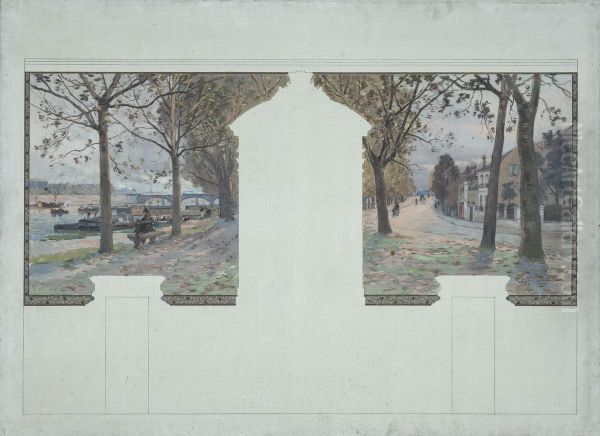 Esquisse pour la salle des fetes de la mairie d'Asnieres : Paysage. Quais de la Seine a Asnieres