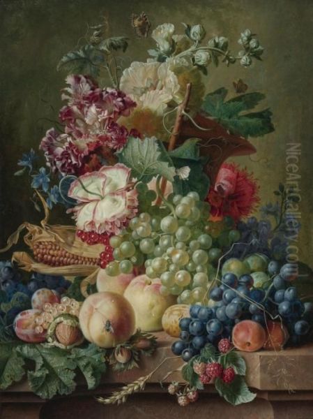 Still Life Of Flowers And Fruits On A Marble Ledge