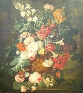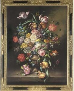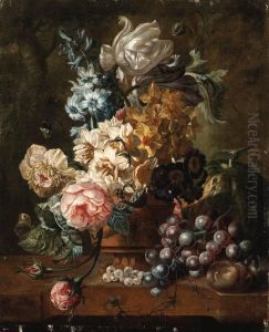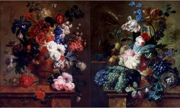 Still Lifes Of Flowers And Fruits On A Marble Ledge: A Pair Of Paintings