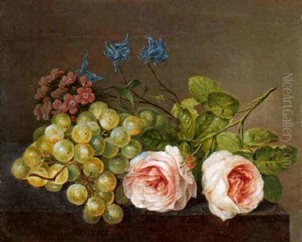 Grapes, Roses, Columbine And Othe Flowers On A Marble Ledge