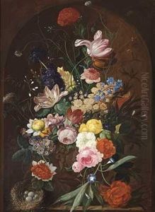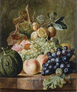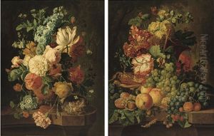 Still Life Of Fruits And Flowers Together With A Bird's Nest Arranged Upon A Stone Ledge