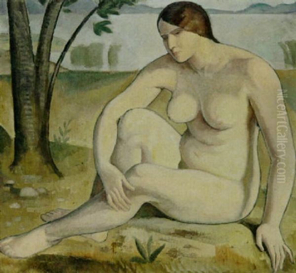 Sitzender Weiblicher Akt Am Seeufer