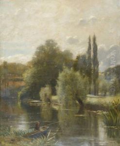 Barque Et Personnage Ramant Sur Une Riviere, Au Loin D'un Village.