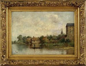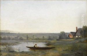 Bord De La Riviere Avec Pecheur Sur Sa Toile D'origine