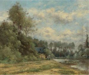 Wooded River Landscape With Peasants.