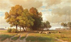 Weite Landschaft Mit Baumgruppe Und Schafherde Im Vordergrund