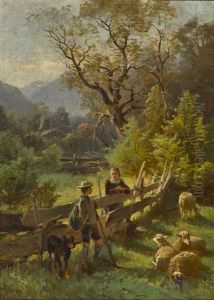 Sonnenbeschienene Almwiese Mit Kuhen Und Hirte Im Schatten Der Baume Ruhend