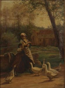"madchen Mit Gansen" Vor Dem Bauernhof Am Flusufer