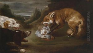 Two Hounds Chasing A Fox With A Dead Partridge