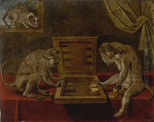 Monkeys Playing Backgammon Watched By A Cat