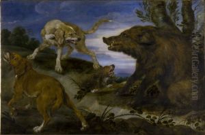 Two Dogs With A Joint Of Meat, A Basket With Game And Vegetables Behind Them