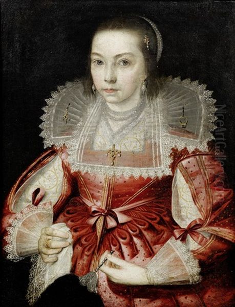 Portrait Of A Girl In A Pink Silk Dress And A Bejewelled Lace Collar And Headdress, Holding A Lace Handkerchief And An Ostrich Feather Fan