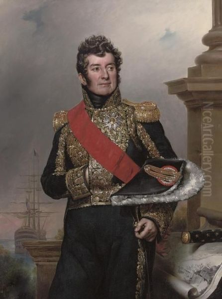 Portrait Of Comte Laurent-jean-francois Truguet, Admiral Of France, Three-quarter-length, Wearing The Sash And Breast Star Of The Legion D'honneur, Standing Before A Pillar, A Ship At Anchor Beyond And A Baton By His Side