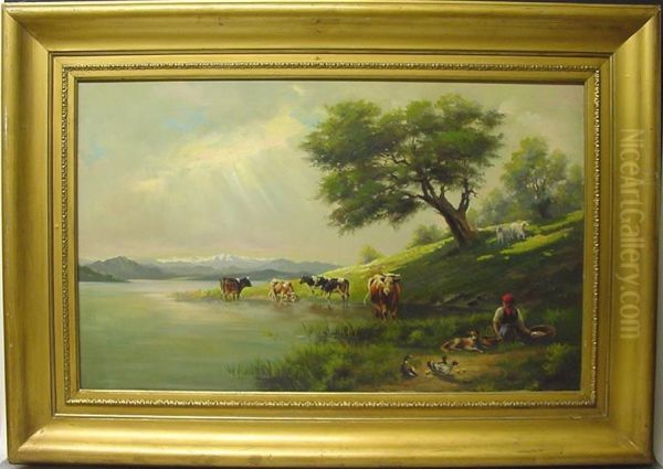 Bauerin Mit Kuhen Und Anderen Tieren An Einem See