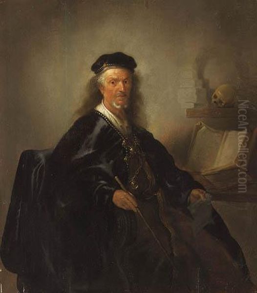 Portrait Of A Mathematician, Seated Three-quarter-length, In Ablack Cloak, Holding A Stick And A Piece Of Paper, A Book Ofgeometry Beside Him