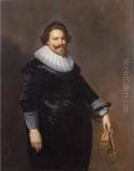 A Portrait Of Ernst Van Reede (died 1640), Lord Of De Vuursche And Drakestein, Standing Three-quarter Length, Wearing A Black Suit, With White Lace Collar And Cuffs, Holding Gloves And A Sabel; A Portrait Of His Wife, Elisabeth Van Utenhove (died