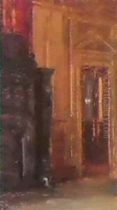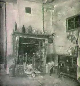 Interior Med Fiskarstuga, En Gammal Kvinna Vid Spinnrocken Och Hennes Man, Som Vaknat Ur Middagsslummern...