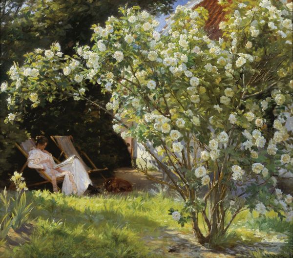 Roses. Marie Kroyer seated in the deckchair in the garden by Mrs Bendsen's house