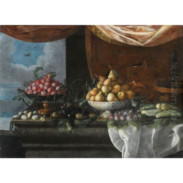 Nature Morte Au Plat De Prunes, Poires, Bouteille Et Rafraichissoir Sur Un Entablement