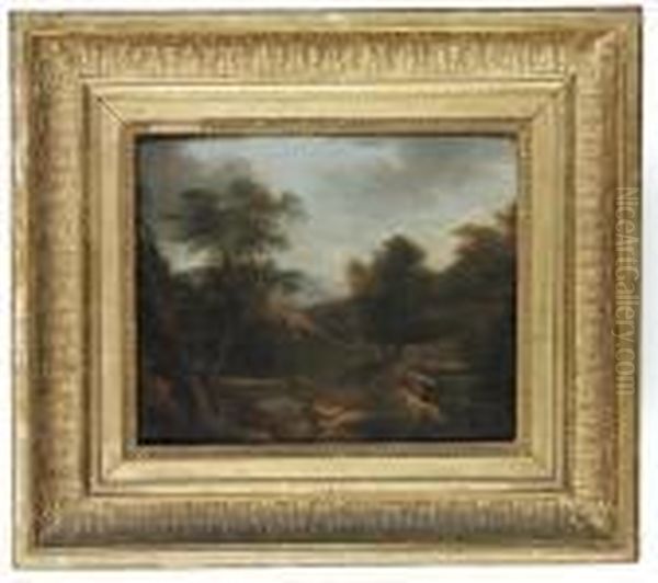 A Mountainous Landscape With Figures On A Path, Passing Acascade