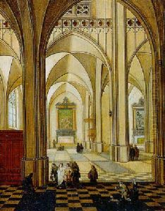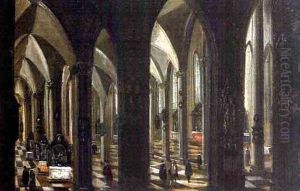 The Interior Of A Gothic Cathedral With Townfolk And Pilgrims