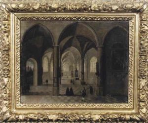 Interior Of A Gothic Cathedral With Figures And Dogs