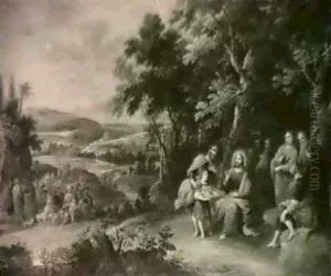 Wooded Landscape With The Holy Family, The Infant Saint John The Baptist And Putti, A Castle And A Lake Beyond
