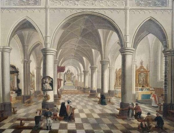 Inneres Einer Dreischiffigen Kirche Mit Figurenstaffagemonogramm.