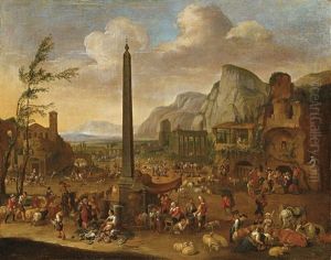 Villagers And Horsemen On A Market Square In An Italianate Town Among Classical Ruins