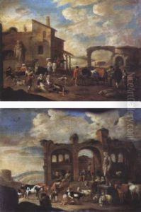 A Capriccio Of A Roman Marketplace With Peasants And Levants At A Fountain