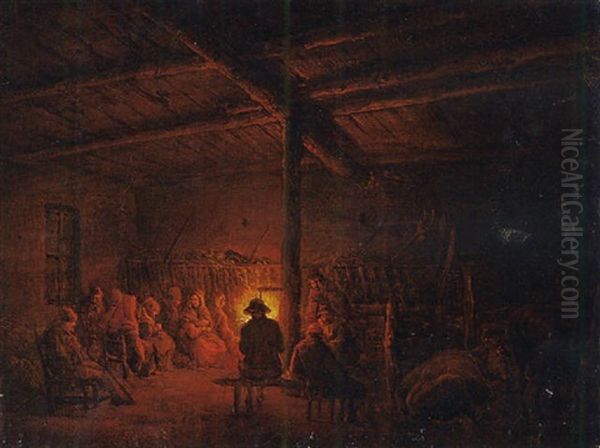 A Barn Interior With Peasants Around A Fire