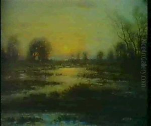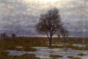 Oversvammat Landskap I Solnedgang