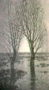 Oversvammat Landskap Med Tradsolnedgang