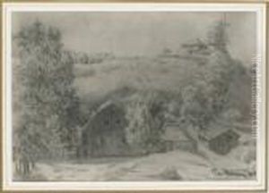 Strom: A Woman On A Yard With Buildings And Chicken. Signed