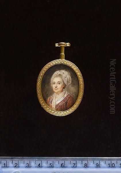 A Lady, Called Mme Geoffrin, Wearing Brown Dress Decorated With Multicoloured Spots, White Lace Collar, White Fichu And Matching Bonnet With Blue Ribbon Tie.
