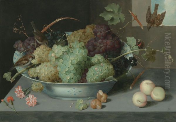 Still life with bunches of grapes in a porcelain bowl, three sparrows, and a butterfly, wirt peaches and snails on a stone ledge below