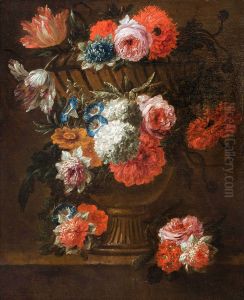 Roses, tulips, convulvus, narcissi and other flowers in an urn, on a stone ledge