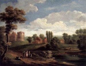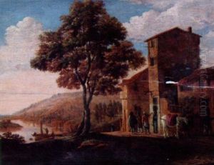 An Extensive River Landscape With Travelers On Path, A House And Church Beyond