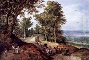 A Wooded Mountainous Landscape With Travellers On Horseback With Hunting Dogs