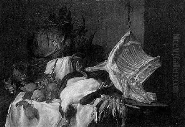 Nature Morte Au Panier De Legumes, A La Piece De Boeuf, Aux Grives, Au Dindon, A La Branche De Coing Et Au Chat