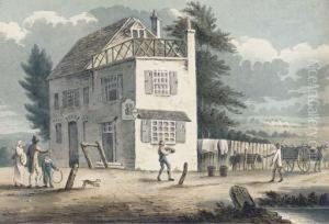 Travellers And Country Folk Outside An Inn With A Watermill Beyond