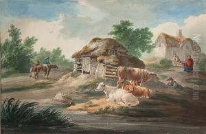 A River Landscape With Cattle Watering And A Family By Their Cottage