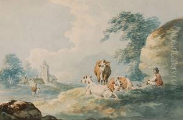 Watercolour, Figures Andcattle Near A Country Road, Unsigned With Gallery Label Verso.6.25" X 9.5"