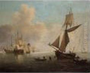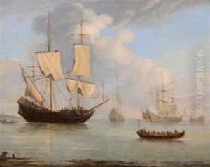 An English Two-decker Preparing To Get Underway From Her Anchorage Surrounded By Other Warships In A Calm