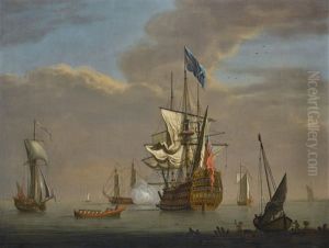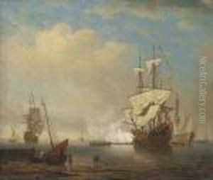 A British Man O' War Firing A Salute In Calm Seas With Other Vessels