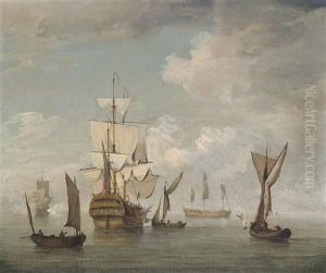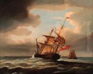 A Dutch Man O'war With Sailors Adjusting The Sails And Other Sailing Vessels At Sea