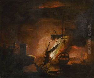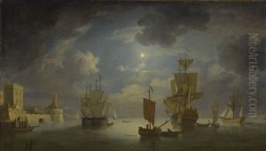 Moonlit Scene With An Indiaman And Other Merchant Shipping Off A Fortified Town