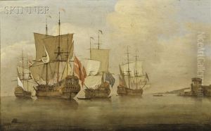 Third Raters From The Red Fleet Outside A Port Entrance And Third Raters With Bare Poles Outside A Coastal Battery, Possibly Calshot Castle, Near Spithead